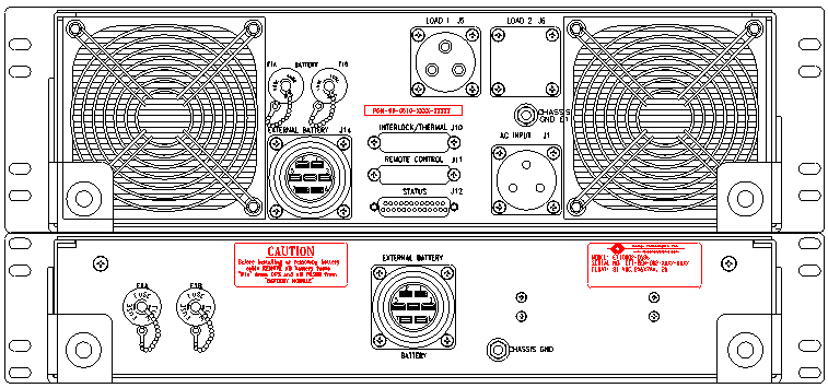 The 3U electronics module can be mounted in the upper section of the rack near eye level or lower in the rack near the battery module. The heavier 2U battery module is usually mounted in the bottom of the rack for lowering the center of gravity of the rack. A  heavy duty shielded cable is provided to connect the two modules. Both chassis have rounded metal corners and rugged handles, both front and rear, aiding in safe handling. Internally, all major components are well secured and electrically insulated to prevent damage due to shock and vibration in any axis. These units can be mounted horizontally or vertically.